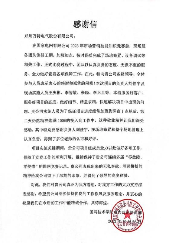2023年10月,國家電網(wǎng)公司2023年市場營銷技能知識競賽在國網(wǎng)技術(shù)學院落下帷幕。在這場盛大的賽事中,我公司以卓越的產(chǎn)品性能和精準的服務支持,保持了產(chǎn)品“零差錯、零故障”運行,贏得了業(yè)界和評委們的一致好評。