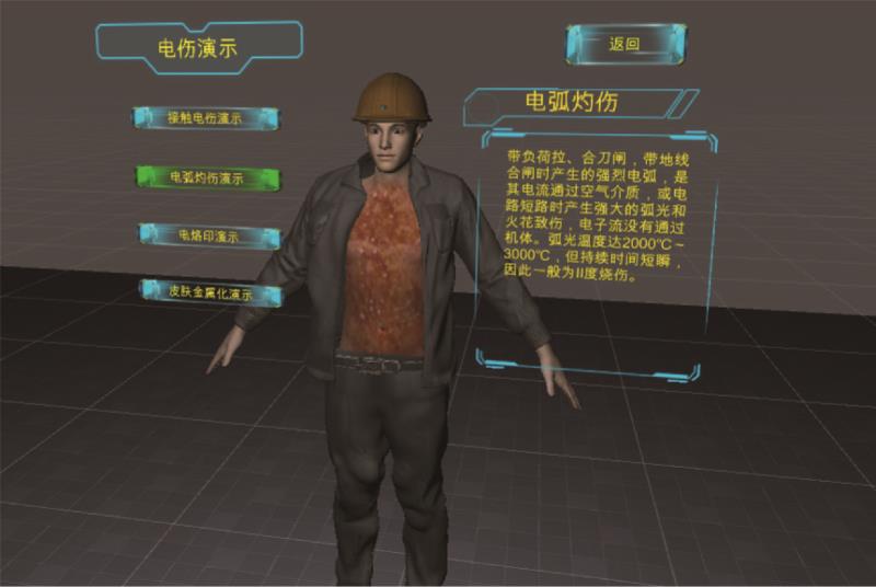 電的危害以VR 的形式展示人體觸電的形式、不同觸電電流對身體的影響、不同電傷形式對人體產(chǎn)生的危害和 人體在各種環(huán)境下人體電阻的變化趨勢等,通過虛實相互結(jié)合、語音圖片相互襯托、特效渲染,將枯燥的文 字轉(zhuǎn)化為動態(tài)的展示,讓學員充分認識、理解觸電的原理、電傷的原理和人體電阻相關(guān)的知識,并通過真實 的觸電體驗感知,使學員從內(nèi)心深處深刻的認識到安全生產(chǎn)的重要性。