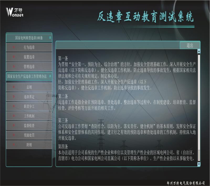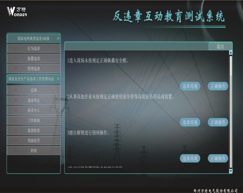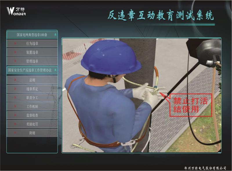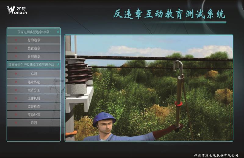 反違章互動測試系統(tǒng)設(shè)計案例依據(jù)國家電網(wǎng)公司編寫的 《國家電網(wǎng)公司安全生產(chǎn)違章100條》,進行編制相關(guān) 事故,遵循《國家電網(wǎng)公司電力安全工作規(guī)程》進行正 確動畫的制作。反違章互動測試系統(tǒng)運用三維動畫等先 進開發(fā)技術(shù)逼真還原事故過程、事故現(xiàn)場,突破了傳統(tǒng) 安全教育不能用視頻重現(xiàn)事故過程的缺點。更真實的展 現(xiàn)違章作業(yè)過程,更直觀的感受到違章作業(yè)后果,更深 刻的理解遵章作業(yè)的重要意義。